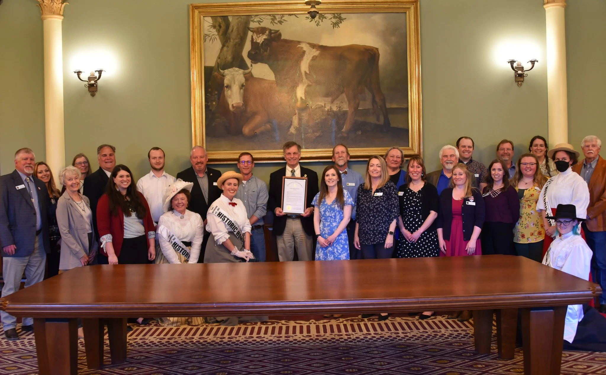 On May 3rd, Governor Mark Gordon officially proclaimed May 2023 as Historic Preservation Month in Wyoming. The signing of the proclamation was attended by members of the Wyoming State Historic Preservation Office, Wyoming State Parks and Cultural Resources, Wyoming Department of Transportation, Wyoming State Archives, local Main Streets, the F.E. Warren Spouses Club Historic Homes Tour Committee, and Representative Sherwood.